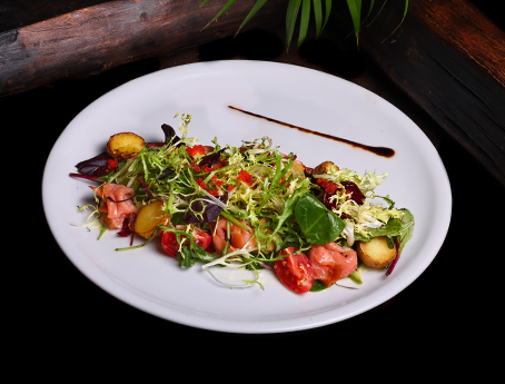 Mix салат, беби картофель, свежий огурец, помидоры "Черри", каперсы, стебель сельдерея, перепелиное яйцо, обжаренный в кунжуте тунец, соус "Шалот" 1 /280 г.
